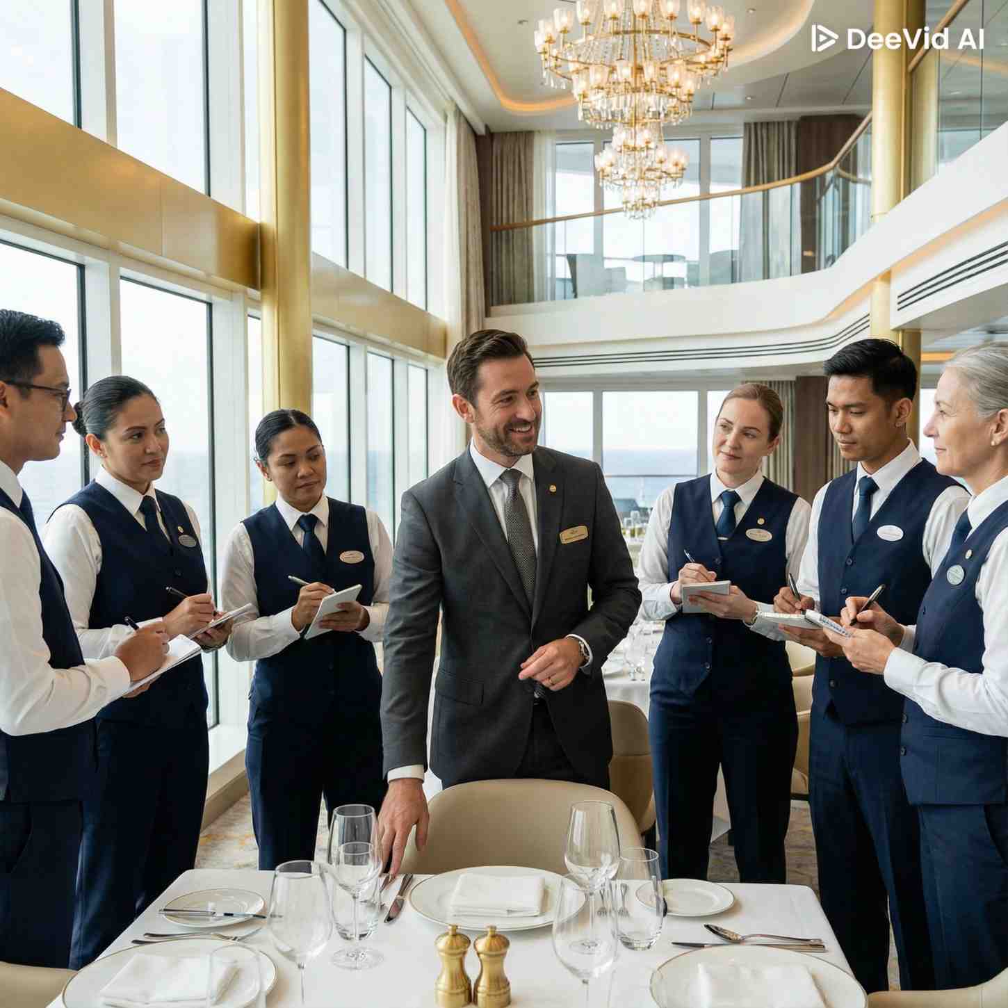Comprehensive training program for luxury dining service including wine pairing, tableside service, and guest interaction. Designed specifically for cruise ship environments with focus on maritime operations.